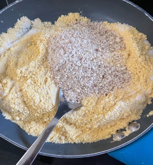 Add the ground almonds and cashew nuts to the pan. Stir well to incorporate.