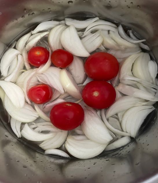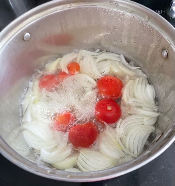 Bring the water to a boil, then reduce the heat to low and cover the pot. Let everything cook until the onions and tomatoes are tender.