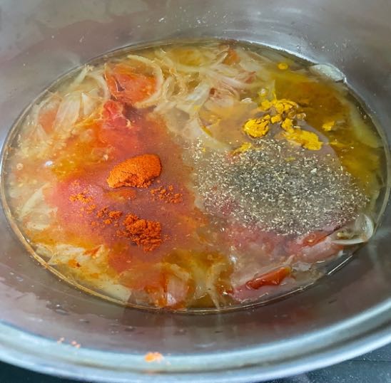 After the onions and tomatoes are tender, increase the heat to high. Stir the mixture and add the ground red chillies, turmeric, and ground coriander. Add oil and continue stirring until everything is well mixed and most of the tomatoes and onions have dissolved.